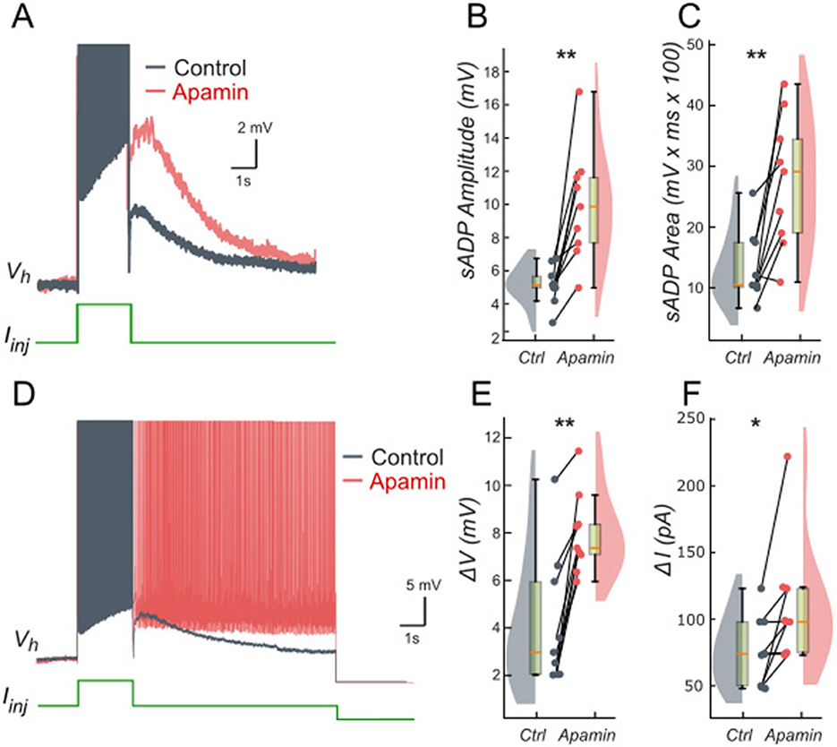 Figure 4. Ca2+-activated K+ current (IKCa) limits the slow afterdepolarization and membrane bistability in lumbar motoneurons. (A) Superimposed voltage traces recorded in the same motoneuron during a brief (2 s) depolarizing current step (bottom) under control conditions (black) and after bath application of apamin (200 nM; red). (B, C) Quantification of the sADP amplitude (B) and area (C). (D) Superimposed voltage traces recorded from the same holding potential (Vh) in response to a 2-s depolarizing current pulse before (black) and after apamin (red). (E, F) Quantification of bistability through ΔV and ΔI. ΔV and ΔI represent the range of holding potentials and holding currents, respectively, over which self-sustained firing can be observed. Each is defined as the difference between the most depolarized and the most hyperpolarized value (potential for ΔV, current for ΔI) at which self-sustained firing is triggered or maintained (see Methods). Paired data from individual motoneurons (n = 9) are linked and overlaid on violin and box-and-whisker plots. *P < 0.05, **P < 0.01, two-tailed Wilcoxon signed-rank test.