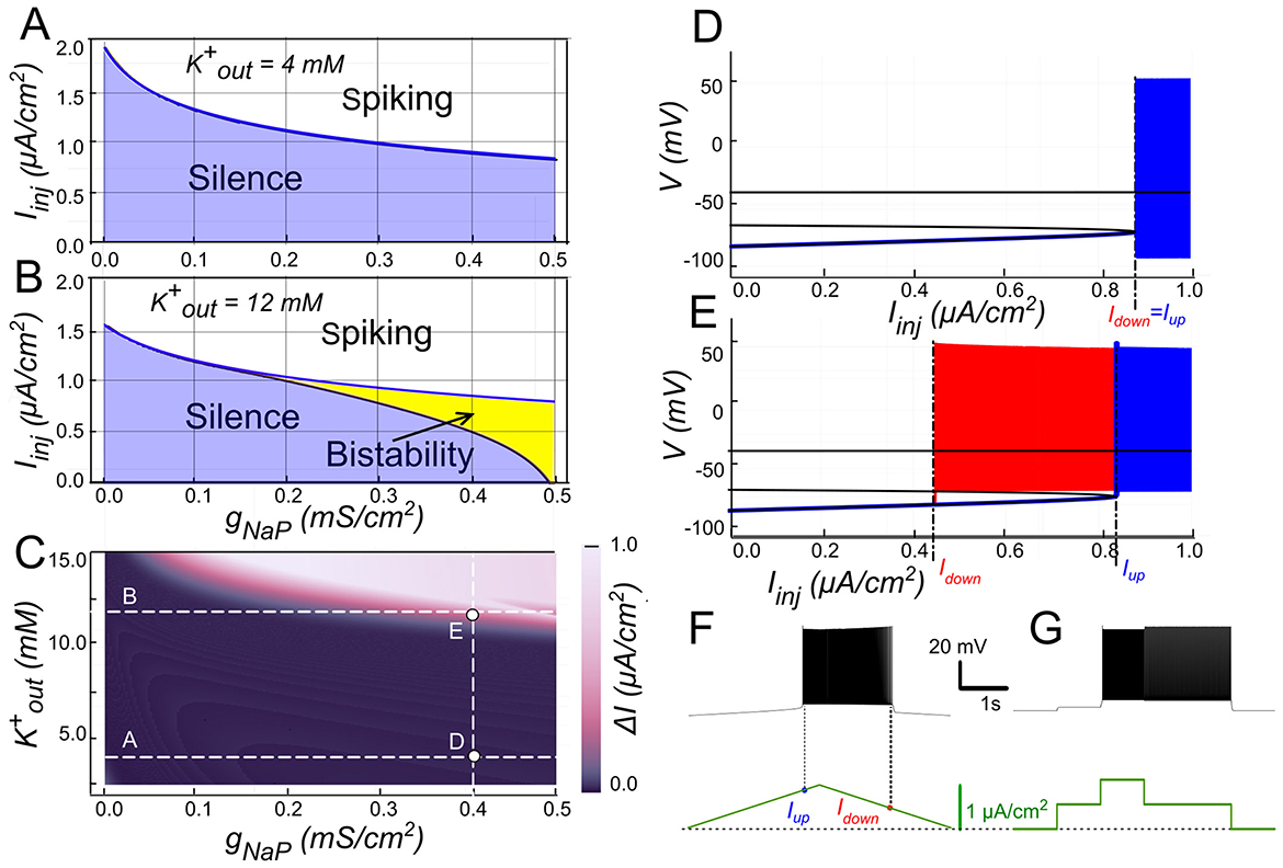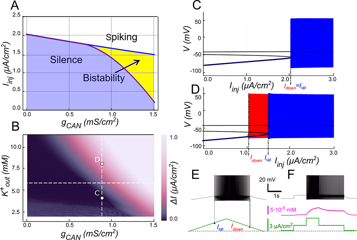 Figure 5. Modulation of ICAN-dependent bistability by extracellular potassium concentration ([K+]o). (A) Bifurcation diagram similar to Figure 3A, constructed for gKCa = 0.5 mS/cm2, but at elevated [K+]o = 6 mM instead of physiologically normal 4 mM. Note, that compared to Figure 3A, bistability emerges at lower gCAN. (B) Color-coded bistability range (Iup – Idown) depending on gCAN and [K+]o. Black area corresponds to no bistability. White dashed line shows the [K+]o value used in (A). gCAN bifurcation value reduces as [K+]o increases, therefore an increase in [K+]o can lead to bistability emergence, as shown in (C, D). If gCAN = 0.9 mS/cm2, at [K+]o = 4 mM (physiologically normal value) no bistability exists (B), but if [K+]o is raised to 8 mM, bistability emerges (C), as illustrated by ramp (E) and step (F) current protocols. (C, D) Blue indicates activity during the ascending current ramp and red indicates activity during the descending current ramp.
