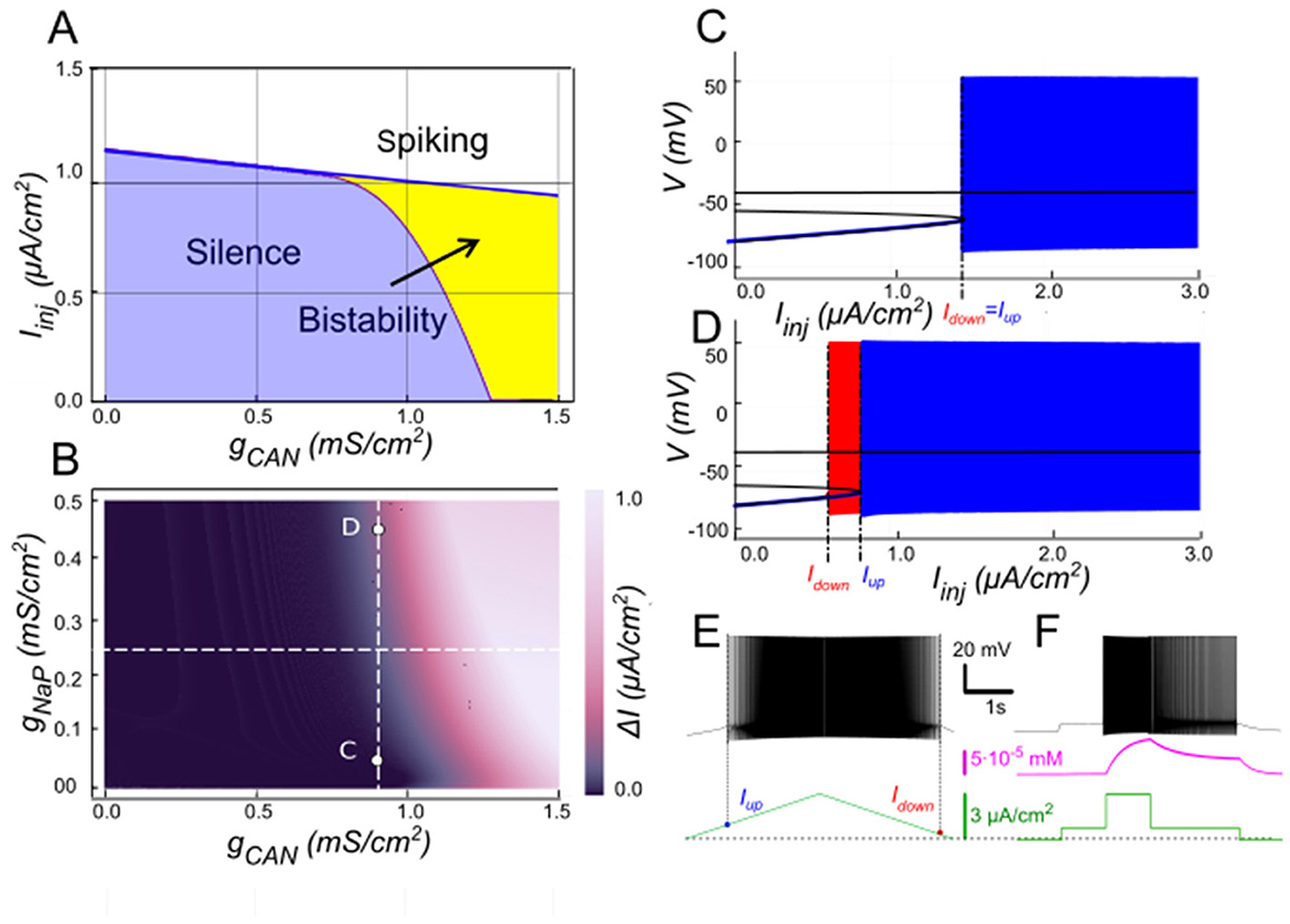 Figure 6. Modulation of ICAN-dependent bistability by INaP. (A) Bifurcation diagram similar to Figure 3A, constructed for gKCa = 0.5 mS/cm2, but at gNaP = 0.25 mS/cm2 instead of zero. Note, that compared to Figure 3A, bistability emerges at lower gCAN. (B) Color-coded bistability range (Iup – Idown) depending on gCAN and gNaP with gKCa fixed at 0.5 mS/cm2. Black area corresponds to no bistability. gCAN bifurcation value reduces as gNaP increases, therefore an increase in gNaP can lead to bistability emergence, as shown in (C, D) where blue indicates activity during the ascending current ramp and red indicates activity during the descending current ramp. If gCAN = 0.9 mS/cm2, at gNaP = 0 no bistability exists (C), but if gNaP is raised to 0.45 mS/cm2, bistability emerges (D), as illustrated by ramp (E) and step current protocols (F).