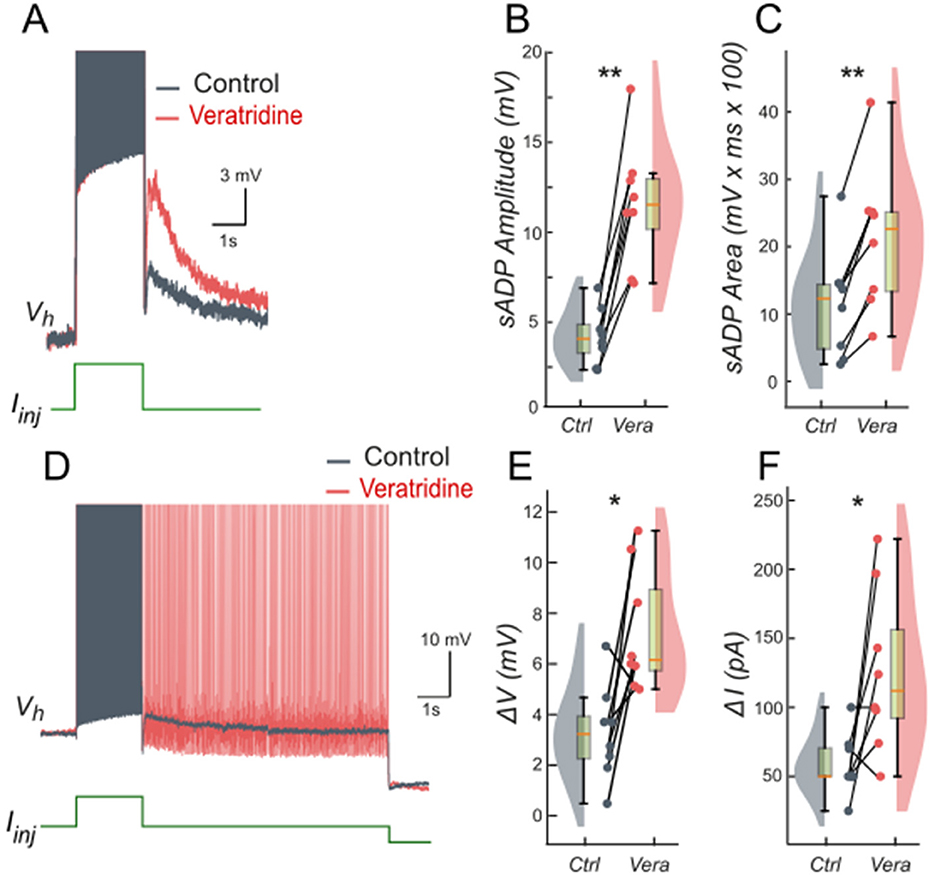 Figure 7. Persistent Na+ current (INaP) facilitates the slow afterdepolarization and membrane bistability in lumbar motoneurons. (A) Superimposed voltage traces recorded in the same motoneuron during a brief (2 s) depolarizing current step (bottom) under control conditions (black) and after bath application of veratridine (40 nM; red). (B, C) Quantification of the sADP amplitude (B) and area (C). (D) Superimposed voltage traces recorded from the same holding potential (Vh = −65 mV) in response to a 2-s depolarizing current pulse before (black) and after (red) veratridine. (E, F) Quantification of bistability through ΔV and ΔI. ΔV and ΔI represent the range of holding potentials and holding currents, respectively, over which self-sustained firing can be observed. Each is defined as the difference between the most depolarized and the most hyperpolarized value (potential for ΔV, current for ΔI) at which self-sustained firing is triggered or maintained (see Methods). Paired data from individual motoneurons (n = 8) are linked and overlaid on violin and box-and-whisker plots. *P < 0.05, **P < 0.01, two-tailed Wilcoxon signed-rank test.