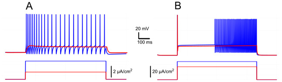 In Figures 2B, C blue and red traces correspond to ascending and descending phases of the current ramp, respectively. For Iinj<Iup= 1.7 μA/cm2, the system displays two attracting regimes separated by an unstable equilibrium (saddle): a stable hyperpolarized state corresponding to the resting state (silent) and a stable spiking state (limit cycle) (Figure 2C). As Iinj exceeds Iup= 1.7 μA/cm2, the low potential stable branch of the V-nullcline merges with the saddle and vanishes via a fold bifurcation, and the system transitions to a stable limit cycle representing a repetitive spiking regime. During the descending phase of the ramp, spiking persists until Iinj decreases to Idown = 1.1 μA/cm2, which is less than Iup (Figures 2C, D), yielding a hysteresis interval (ΔI > 0 with Idown<Iup), indicative of bistability.