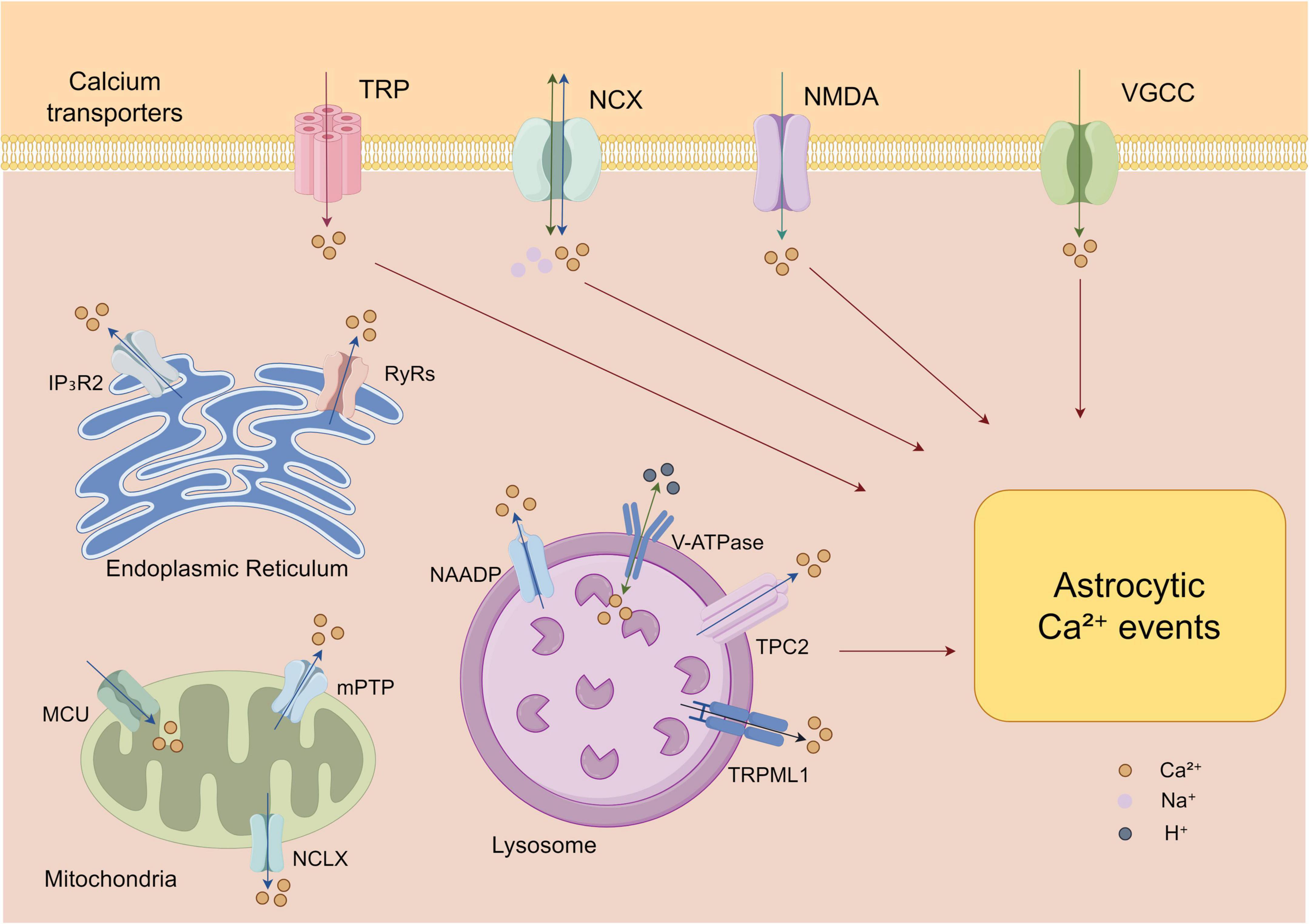 Astrocytic intracellular Ca2+ signals originate from diverse sources, broadly categorized into internal stores and extracellular influx. The major intracellular reservoirs include the endoplasmic reticulum, mitochondria, and lysosomes, which regulate cytosolic Ca2+ homeostasis and dynamics through release and reuptake mechanisms. Extracellular Ca2+ entry, on the other hand, is mediated by multiple membrane channels and receptors, such as transient receptor potential (TRP) channels, N-methyl-D-aspartate (NMDA) receptors, sodium–calcium exchangers (NCX), and voltage-gated Ca2+ channels (VGCCs). These pathways enable Ca2+ influx in response to membrane depolarization or neurotransmitter stimulation, thereby shaping the spatiotemporal profile of astrocytic Ca2+ signaling.
