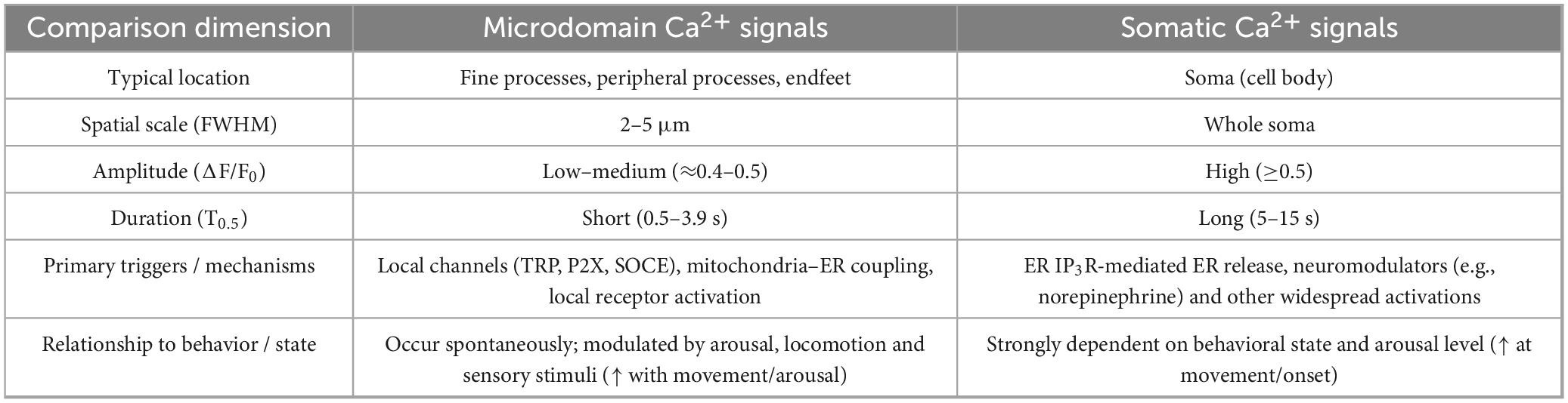 Microdomain Ca2+ signals in astrocytes denote spatially restricted, small-scale Ca2+ events that occur within fine processes or endfeet (Lia et al., 2021). Such microdomain activity is observed in both anesthetized and awake animals and persists even when neuronal activity and most neurotransmitter receptors are pharmacologically blocked, indicating that microdomain events can arise spontaneously (Takata and Hirase, 2008; Nimmerjahn et al., 2009). The origins of microdomain Ca2+ signals are heterogeneous, encompassing IP3R2-dependent ER release, mitochondrial Ca2+ efflux, and Ca2+ entry through membrane channels such as TRPV4 (Bai et al., 2024). Genetic and pharmacological work in invertebrate and vertebrate systems further illustrates this diversity: for example, a class of microdomain transients in Drosophila astrocytes is mediated by the TRP channel TrpML, is sensitive to reactive oxygen species and tyramine (via TyrRII), and requires extracellular Ca2+ while being TTX-insensitive—consistent with microdomains arising from both membrane channels and organelle–membrane coupling (Ma and Freeman, 2020; Bindocci et al., 2017). High-resolution 3D imaging studies localize the bulk of basal microdomain activity to fine processes, with relatively sparse somatic events; endfeet show Ca2+ signals but are often less frequent and less synchronized than processes (Bindocci et al., 2017). Microdomain events typically occur at higher frequency than somatic events but exhibit variable amplitudes and durations depending on brain region, indicator choice, and analysis methods. For instance, spontaneous process Ca2+ events in hippocampal cortex have reported half-widths (T0.5) on the order of ∼0.5–3.9 s and peak amplitudes reported in some studies as on the order of dF/F0; in hippocampal CA3 stratum lucidum, process events exhibited amplitudes ∼0.4 dF/F and durations of ∼6 s—metrics that can differ between studies owing to methodological factors (Shigetomi et al., 2010; Haustein et al., 2014). Critically, microdomain Ca2+ dynamics are tightly coupled to behavioral state and are implicated in the regulation of arousal, sleep, and locomotion (Wang F. et al., 2023). For example, astrocytic Ca2+ activity is markedly reduced during rapid eye movement (REM) sleep and increases upon awakening, underscoring a state-dependent modulation of microdomain signaling (Tsunematsu et al., 2021).
