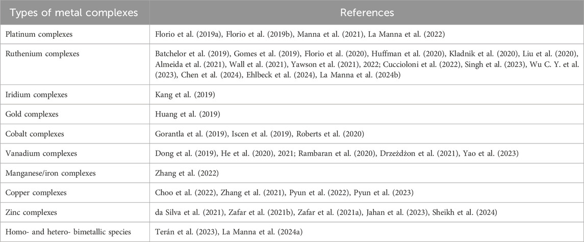 Metal complexes evaluated in this context comprise platinum, ruthenium, iridium, gold, cobalt, vanadium, manganese/iron, copper and zinc complexes along with homo- and hetero-bimetallic species (Table 2). Promising results were obtained in vitro and in cellular models. However, few have been evaluated in vivo, often due to BBB crossing challenges.