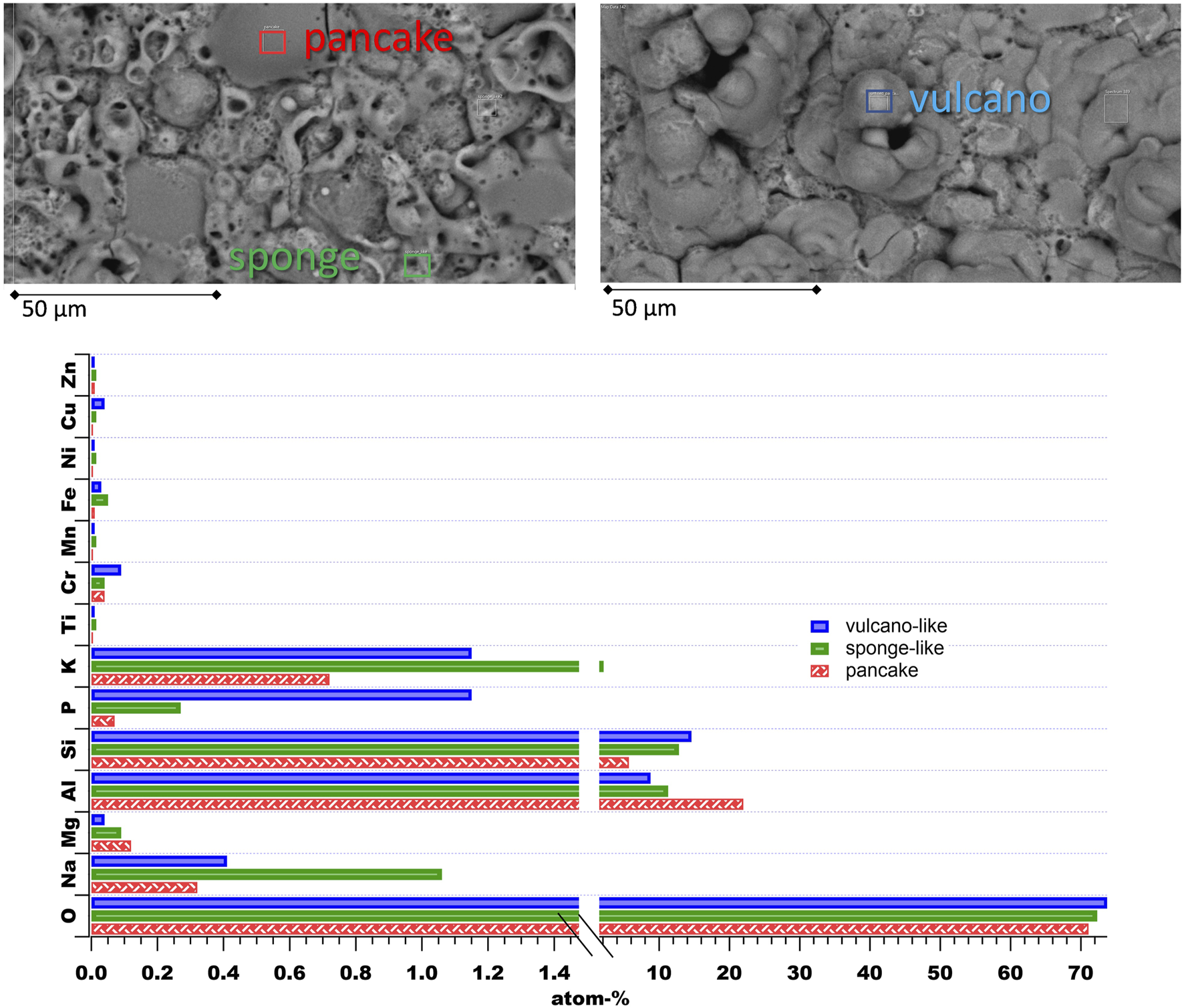 The PEO surfaces show three main features, which are shown in Figure 2. They can be divided into flat and pancake-like structures, and sponge-like structures, which appear as a network, and volcano-like structures, exhibiting some open porosity. All of these are known to be formed during PEO processes under different conditions (Clyne and Troughton, 2019; Ntomprougkidis, 2020). The pancake-like structure exhibits the highest Al-O-contribution with a low content of Si and other electrolyte elements. They are formed due to micro discharging events, which are filled with fast solidification aluminum oxide. Sponge-like networks contain a high amount of electrolyte elements, such as Na and K. Such structures are linked to the soft-spark regime in the literature (Ntomprougkidis, 2020). The volcano-like structures are also assumed to result from the micro discharging events, but the resulting channels are not filled with further molten oxide. In the case presented here the volcano-like structures exhibit an increased amount of Si. It can be concluded that Si-rich areas near the surface of the substrate material may be the reason for this type of feature.