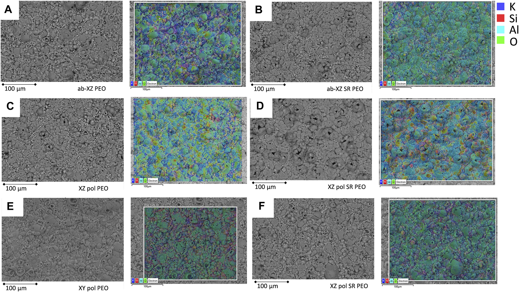 PEO on the different printed surfaces; left: BSE-SEM figure; right: EDS elemental distribution of the same position; (A), (B) XZ-ab PEO; (C), (D) XZ-pol PEO, (E), (F) XY-pol PEO.