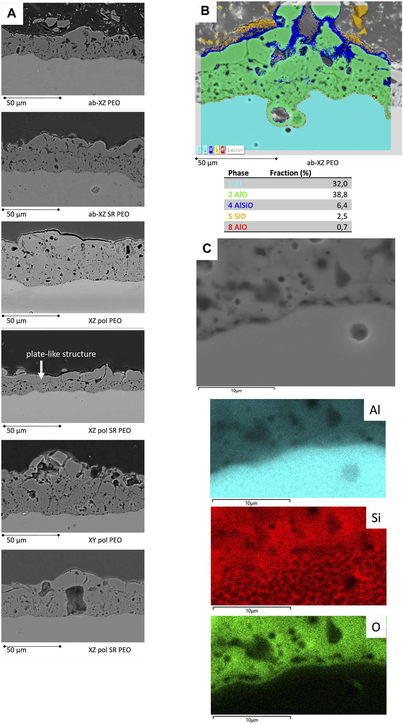 The PEO applied on the as-built surface exhibits a homogeneous distribution of a pancake- and sponge-like structure (see Figure 3A, first row). Without significant change in overall surface roughness (see Table 2), the PEO surface reduces the height of the peak roughness and forms a leveled surface. Although the topography of the stress-relieved samples does not defer from the untreated surfaces, the PEO on the stress relieved surfaces shows a more volcano-like structure. This structure becomes more obvious on the polished stress relieved XZ sample. As mentioned above, the volcano-like structure might be the result of eruption of the molten metal oxide from micro discharge events. Large Si grains may lead to a more intensive eruption, as they are found in the SR surface (see Figure 1B) and were reported to be formed by SR treatment (Cabrini et al., 2018). Furthermore, SR treatment leads to an increased native oxide layer, which is also indicated by the increased oxygen concentrations after the SR process for all samples (see Figure 1C) on the surfaces. This oxide layer requires high breakdown potential and, thus, high energy to be overcome at the beginning of the PEO process. This might result in fast solidification of the molten oxide. In the case of PEO on the XZ-polished samples, there seems to be an orientation of elemental contribution (see EDS mapping in Figure 3 c and d): Here, the Al, O and K appear in vertical lines. From the top view, the PEO structure on the polished XY plane shows a structure that seems to be independent of the SR process (compare Figure 3 e and f). This might be due to the lower difference of the oxygen concentration of the XY-pol (1.6-atom-%) and XY-pol-SR surface (2.9-atom-%) (compare EDS results in Figure 1C). A further reason for the different PEO structures on the different planes (XZ and XY) might be an excessive amount of melting pools that possess more Si grains in the XZ direction.