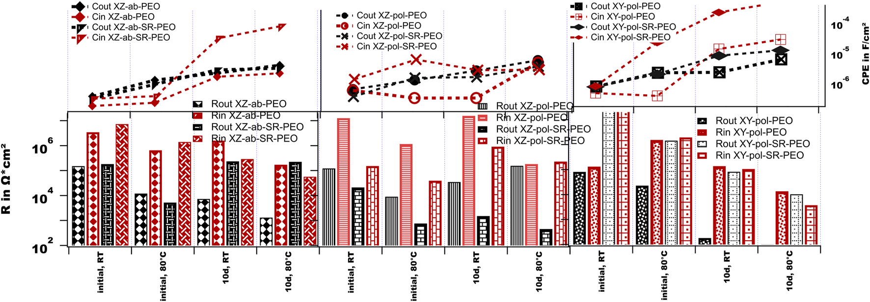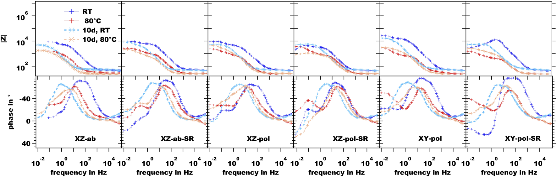 The XY-pol-SR-PEO sample shows the highest impedance values at the initial measurements. This might be due to it possessing the highest coating thickness value (see Table 2). However, the capacitance of the inner layer increases with the high temperature, thereby providing evidence of penetrating electrolyte as shown in Figure 14F (left): corrosion occurs at the interface, and its products can be found in the pores. After long-term immersion, this sample shows the highest increase in capacitance of the inner layer accompanied by the lowest impedance value for the inner layer at high temperatures. Taken into account the corrosion picture (Figure 14F right), this behavior can be explained by a wide and shallow pitting underneath the PEO with corrosion products, which are transferred above the PEO surface.