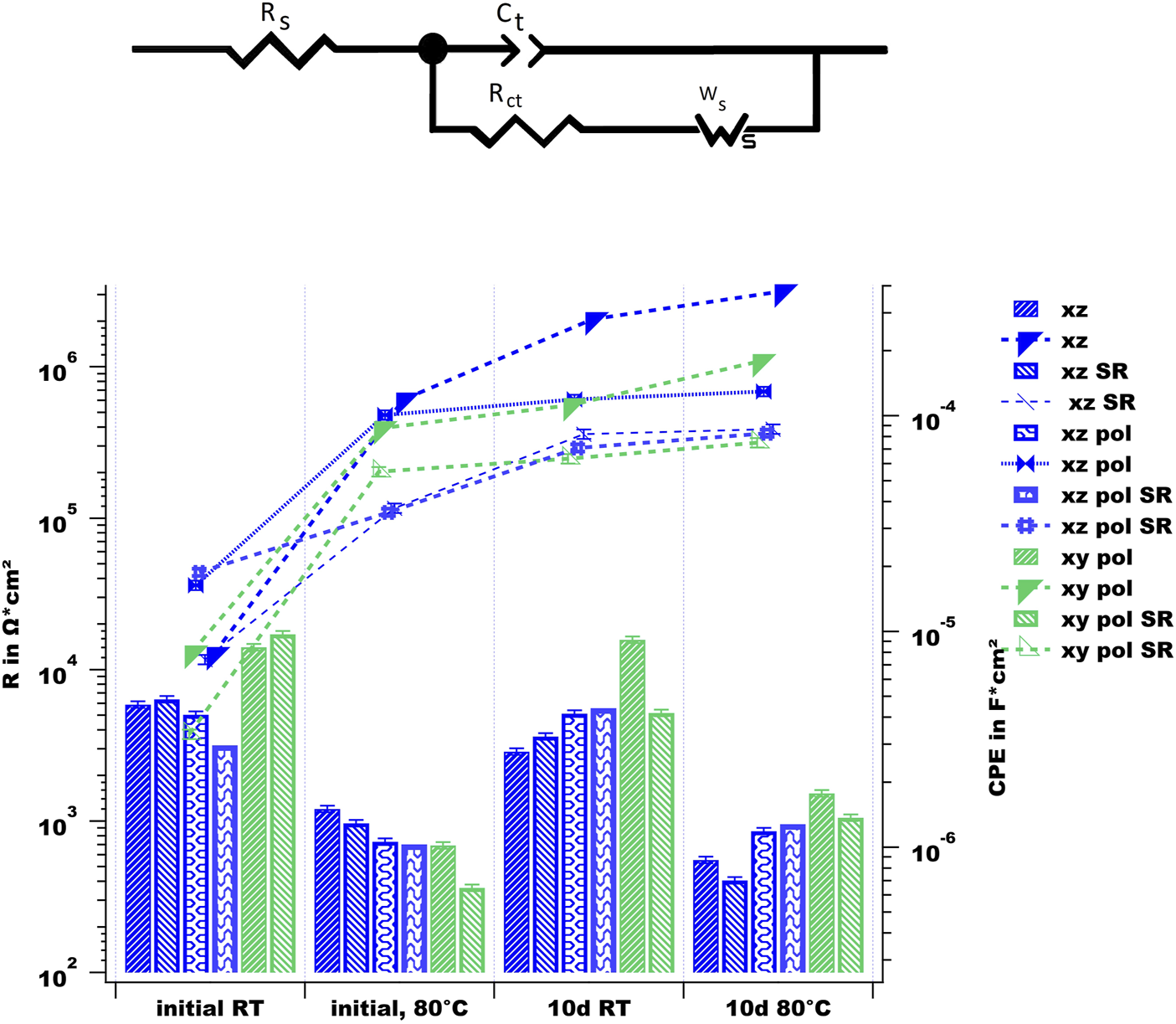 In Figure 10, the equivalent circuit (EC) model for the bare surfaces and the simulated results are shown. In the EC, Rs represents the resistivity of the electrolyte, whereas Ct is the phase constant element representing the double-layer capacitance of the electrolyte and the rough and non-ideal sample surface. Rct is the value of the charge transfer resistance and, thus, the corrosion resistance, and the Warburg impedance Ws represents charge carrier diffusion through a material (Bajat et al., 2013) and is linked to the diffuse tail in the low frequency range and is typical for corrosion processes, where diffusion of oxygen is involved (Chen et al., 2016; Leon and Aghion, 2017). The fitting values of Rct and Ct over time and at various temperatures are drawn for comparison in the same figure. The Rct values decrease by increased temperature, which indicates a destabilization of the electrode surface at higher temperature (Chen et al., 2016). The as-built surface does not show significant differences in behavior; taking into account the SR heat-treatment, only the Ct value increases at a slower rate for the SR sample. This can be correlated with the difference in the corrosion behavior discussed above. Due to the weakened Si network in the case of SR treatment, the corrosion spreads wider. In terms of the corrosion resistance values, SR treatment does not have an influence, which is in agreement with the literature (Cabrini, Lorenzi, et al., 2016b). The polished surface of the XZ direction exhibits an increase in Ct just after the first measurement at 80°C; afterwards., its values are stable. Both the XZ-pol and XZ-pol-SR sample show wider corrosion attacks accompanied by a lack of an oxide layer (see Figure 8). From the EIS measurements, it could be concluded that polishing leads to an increased corrosion resistance for the surfaces in terms of long-term immersion, which is in agreement with most of the literature (Cabrini et al., 2016a; Cabrini et al., 2016b; Fathi et al., 2018; Revilla et al., 2020). The better corrosion protection of the polished surfaces is assumed to result from the removal of cavities and other surface defects by polishing the AM surfaces. Such defects are assumed to induce localized corrosion (Revilla et al., 2020). However, taking the cross-sectional views of the corrosion effects in Figure 8 into account, it becomes obvious that there are deep corrosion attacks with corrosion products on the surface that lead to the increased impedance values. This proves the theory of (Fathi et al., 2018), who found grounded specimens being attacked selectively deeper than as-built surfaces next to the melting pools along the heat-affected zones. They assumed that during the initial state of immersion into the corrosive medium, the internal microstructural features play a more dominant role (Revilla et al., 2020) than that of the surface defects.