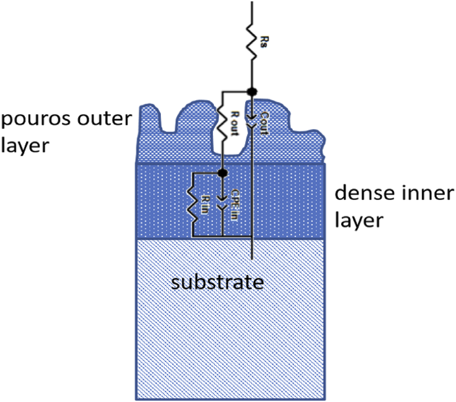 In Figure 11, the EIS measurement results for the PEO-treated surfaces are shown in dependance of temperature and long-term immersion. In comparison with the impedance values at the low frequency limit, which is related to the corrosion resistance of the surfaces, all of the PEO-treated surfaces show increased values by two orders of magnitude, thereby providing evidence for high corrosion protection. Furthermore, the phase diagrams show two time constants, which can be linked to a two-layer system of the PEO surface (Bajat et al., 2013; Dehnavi et al., 2015). Figure 12 shows the equivalent circuit model, which was used to interpret the EIS results of the PEO treated surfaces (Toulabifard et al., 2020). Here, the PEO is divided into two layers, a porous outer layer (time-constant at higher frequencies) and a dense inner layer (time-constant at low frequencies). It is commonly accepted that Rin, attributed to the dense inner layer, is significantly responsible for the corrosion protection of PEO coatings (Aliramezani et al., 2017).