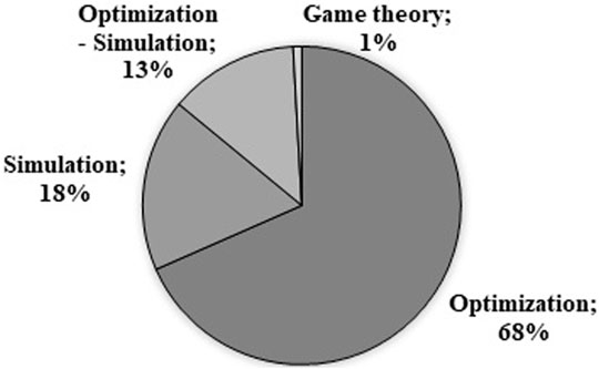 Figure 6 shows that optimization is most frequently used (75%, 64 studies), followed by a combination of optimization and simulation (18%); simulation is used in 6% of the cases, and 1% of the studies (1 study) used game theory.