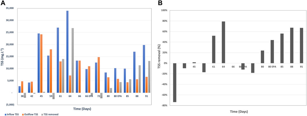 When the TSS is mostly organic, it can be biologically consumed during the treatment process. BETT Demo Unit demonstrated sufficient TSS removal rates after day 72 of system operation (Figure 6). TSS removal rates reached up to 26,800 mg.L−1 in 4 h HRT, which corresponded to 79% removal. It has to be noted that the incoming TSS was for the most part higher than 10,000 mg.L−1 and in some cases was in the range of 20,000 mg.L−1 to 34,000 mg.L−1 TSS. The high TSS removal rate is partially due to the settling of solids inside the reactors. The solids degradation is usually a slower process compared to the degradation of soluble organics. The accumulated solids ultimately break down but the solids residence time is sufficiently longer than soluble COD.