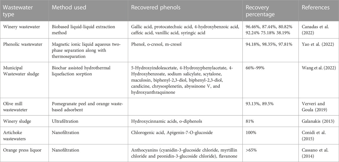 The combination of membrane processes, such as MF, UF, NF, and RO, is recommended as a good alternative in this regard by a number of studies (Zagklis et al., 2015; Bazzarelli et al., 2016; Nazir et al., 2019) (Table 4). Solvent extraction is popularly used on OMWW to recover phenolic compounds (Goula and Gerasopoulos, 2017). In order to get all of the phenolic compounds out of the OMWW, different solvents are needed that make the process more complicated, take longer time, and cost more currency (Tsakona et al., 2012; Galanakis. 2013). Adsorption is considered the most appropriate method for recovering OMWW phenolic compounds because it is cost-efficient and commonly used (Mahmoud et al., 2020; Mahmoud et al., 2022b).