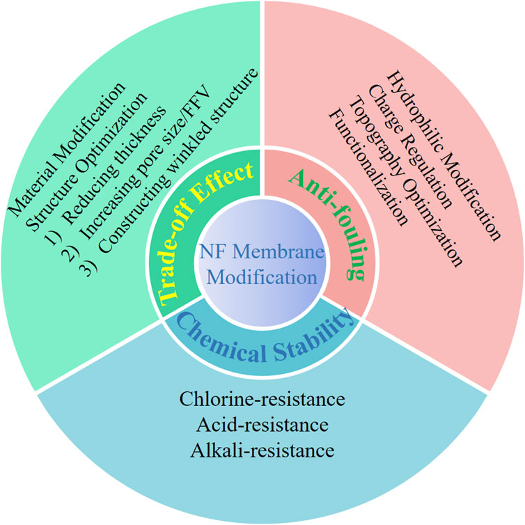 The improvement of the anti-fouling performance of NF membranes is one of the cores of its application. The key idea of the modification strategy is to change the properties of the membrane surface through physical or chemical methods, thereby weakening the interaction between pollutants and the membrane surface. Specific strategies need to be developed to direct the regulation of membrane surface properties in accordance with the composition of water.