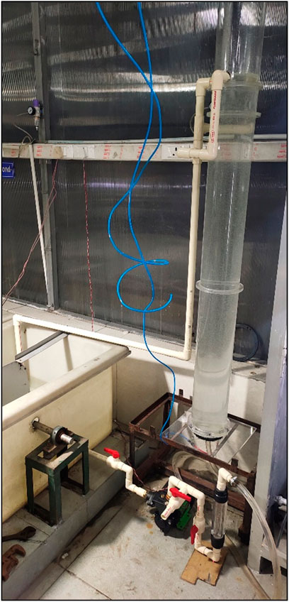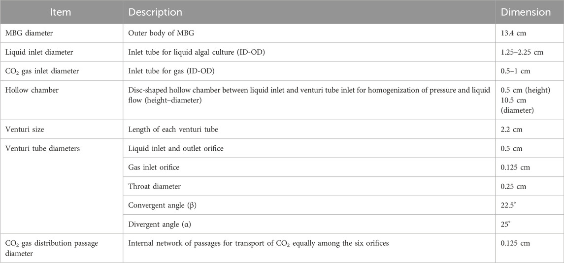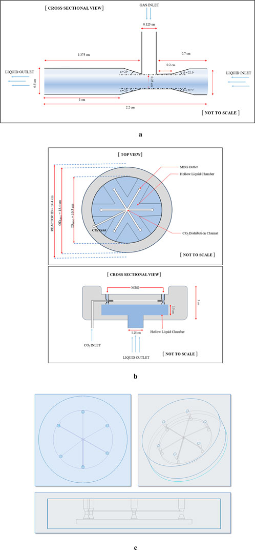 The removal of CO2 from industrial flue streams, particularly those with low CO2 concentrations (5%–10% v/v), using aqueous-based liquid phases such as alkaline solutions, amine solutions, and nano emulsions has been the primary challenge (Olabi et al., 2022). The most explored gas–liquid contactor—bubble column reactors along with their conventional ceramic and steel perforated spargers—faces criticism in terms of difficult bubble size regulation and mass transfer efficiency, lack of consistency in bubble–liquid hydrodynamics at scale-up, and bubble–algal cell interactions that affect biomass growth (Rezvani and Rostami, 2023; Uyar et al., 2024). Enhancing CO2 mass transfer efficiency in bubble columns can be achieved by increasing gas holdup and the gas–liquid interfacial area (Salehizadeh et al., 2020). Recent studies have demonstrated that microbubbles (<1,000 µm) significantly improve CO2 delivery efficiency in raceways by providing a larger interfacial area and longer gas residence time with minimal buoyancy (Yin et al., 2015; Cheng et al., 2016; Yang et al., 2016; Li et al., 2019). Among various microbubble generation systems, Venturi-type injectors are particularly practical and find extensive applications in various industrial processes (Bae et al., 2022). Bubble formation through hydrodynamic cavitation at the Venturi throat produces a wide distribution of micron to millimetre sized bubbles, with their size and distribution closely governed by liquid and gas flow rates (Li et al., 2017; Feng et al., 2020; Dey et al., 2020).