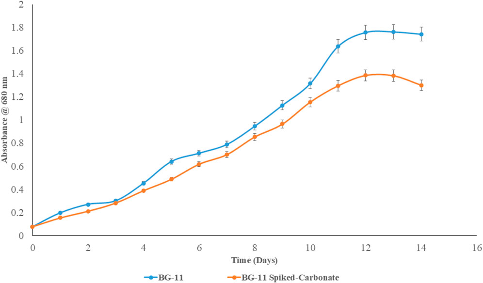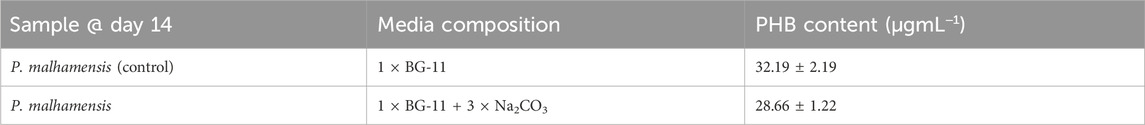 Shake-flask studies were done using standard BG-11 media (HiMedia) in 250 mL conical flasks in a rotary shaker at a regulated 25 °C ± 0.5 and 24 h illumination of 32 μmol m−2s−1 at 110 RPM. (Orbitek, Scigenics Biotech, India). Furthermore, to assess whether higher concentrations of carbonates (2–3 times higher) influence PHA production or biomass yield, BG-11 cultures were supplemented with three-fold sodium bicarbonate (compared to standard BG-11 media having an Na2CO3 concentration of 0.02 gL−1). The OD680 and chlorophyll-a content were measured to determine the batch growth, and experiments were stopped once a stationary phase was attained and a drop in OD reflected the onset of cell death.
