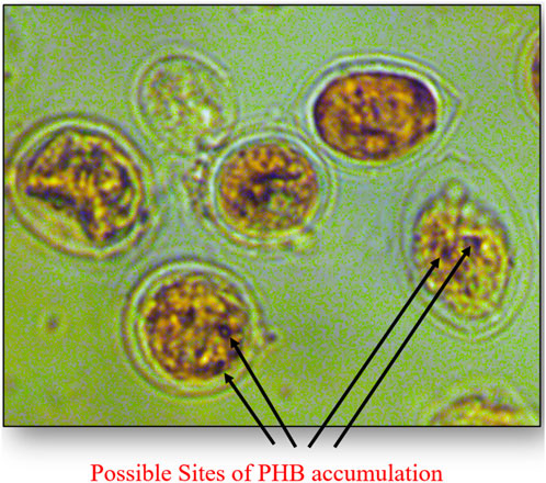 To verify intracellular polyhydroxyalkanoate (PHA) accumulation, a method proposed by Wei et al. (2011) was adopted that included live cell staining using Sudan Black B (Merck). To perform Sudan Black B staining for intracellular PHA identification, 20 µL of mature (15th day) microalgal culture was heat-smeared onto a clean glass slide to fix the cells. The slide was then flooded with 0.3% (w/v) Sudan Black B (Merck) solution (prepared in ethanol) and incubated for 20 min in a chamber maintained at 30 °C to enhance the staining process. After incubation, the slide was rinsed gently with 70% (v/v) ethanol to remove any excess stain. Safranin was added for 30 s to counterstain the background cells. Finally, the smear was observed under oil immersion phase-contrast microscopy at ×100 magnification (Nikon Eclipse Ti-U, Japan), where PHA granules appeared blue-black against a pinkish background. This protocol effectively visualizes intracellular PHA granules in microalgal cells.