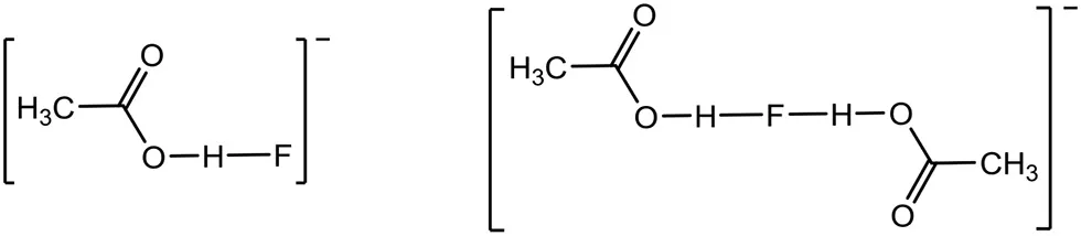 Larson (Larson and McMahon, 1983) carried out gas phase measurements of the binding energy of fluoride with a variety of Brönsted and Lewis acids. The binding energy of the ethanol to fluoride hydrogen bond was found to be 132 kJ mol−1, a strong hydrogen bond that is not much weaker than that measured for hydrogen fluoride to fluoride (bifluoride) at 161 kJ mol−1. Other measurements have suggested this was low and found a bond energy of 191 kJ mol−1 (Wenthold and Squires, 1995). The strong hydrogen bond suggests that the alcohol solvate can be thought of as a discrete species. Fluorohydrogenate ([F(HF)x]−) anions in ionic liquids are considered as a discrete species, and have received considerable attention in the literature due to high conductivities and low viscosities (Hagiwara et al., 1999, 2003).