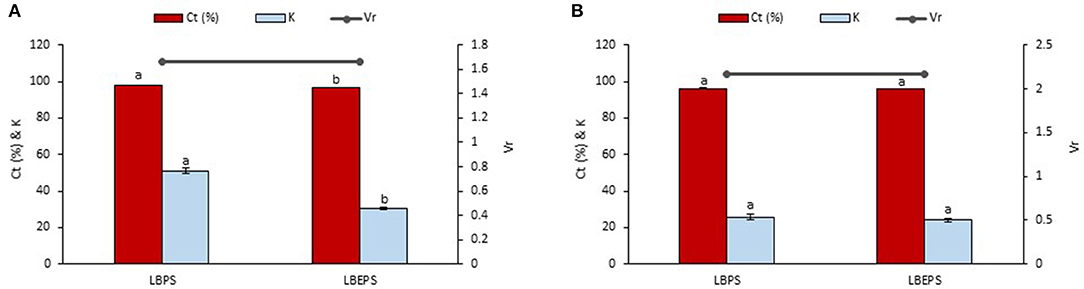 Figure 2. Comparison study of betacyanins extraction from (A) peel and (B) flesh of red-purple pitaya using LBPS and LBEPS with initial settings. Values are mean ± SD of triplicate readings. Different letter(s) represent a significant difference (p < 0.05) using Tukey's test within Ct and K.
