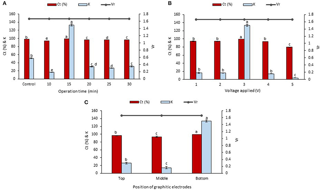Figure 3. Effects of various parameters in LBEPS for betacyanins extraction from peel of red-purple pitaya; OFAT approach was applied in the optimization study: (A) operation time (control: LBPS), (B) voltage applied and (C) position of graphitic electrodes. Values are mean ± SD of triplicate readings. Different letter(s) represent a significant difference (p < 0.05) using Tukey's test within Ct and K.