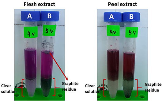 Effect of the voltages applied ranging from 1 to 5 V in the LBEPS for betacyanins extraction from peel and flesh of red-purple pitaya was investigated, and the results are presented in Figures 3B, 4B, respectively. The betacyanins extraction using LBEPS with 3 V of voltage applied showed the significant highest values of Ct and K of betacyanins from the peel (99.256 ± 0.014% and 133.433 ± 2.566, respectively) and flesh (97.189 ± 0.172% and 34.665 ± 2.253, respectively). Meanwhile, the values of Ct and K of betacyanins from the peel and flesh obtained from the betacyanins extraction using LBEPS with 1, 2, and 4 V of voltage applied were noted to be no significant difference among them (p > 0.05). However, the betacyanins extraction using LBEPS with 5 V of voltage applied showed the significant lowest values of Ct and K of betacyanins from the peel (79.737 ± 0.419% and 3.937 ± 0.101, respectively) and flesh (88.231 ± 0.162% and 7.498 ± 0.116, respectively). Additionally, with the 5 V of voltage applied, the graphitic electrodes were oxidized and graphite residue was observed in the salt-rich bottom phase, as shown in Figure 5. Furthermore, Vr values in the LBEPS with different voltages applied for the peel and flesh showed that different voltages do not influence the biphasic separation much, due to their similar values among the others; LBEPS with peel: 1.667 and LBEPS with flesh: 2.167.