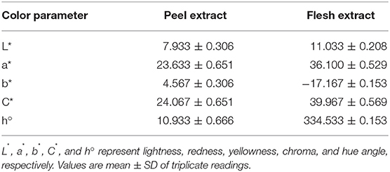 Table 2. Color characterization of peel and flesh extract of red-purple pitaya obtained from the optimized LBEPS.