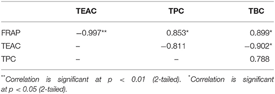 Lastly, the antioxidant properties on peel and flesh extract of red-purple pitaya (ethanol-rich top phase) were assessed in order to examine their antioxidant capability and the presence of antioxidant compound. These extracts were obtained from the optimized LBEPS. Particularly, FRAP and TEAC are used to measure the antioxidant capability, while TPC and TBC determined the quantity of antioxidant compound (Dai and Mumper, 2010). In the FRAP assessment, the peel extract (61.767 ± 1.460 μmol of Fe(II)/g of crude extract) showed a significant higher FRAP value compared to that of the flesh extract (35.916 ± 0.489 μmol of Fe(II)/g of crude extract) (standard equation: A593 = 0.0006([FeSO4·7H2O]) + 0.0708 (R2 = 0.9984); A593: absorbance value at 593 nm & [FeSO4·7H2O]: concentration of FeSO4·7H2O). On the other hand, the peel extract (35.460 ± 0.443 μmol of TEs/g of crude extract) showed a significant lower TEAC value compared to that of the flesh extract (59.606 ± 0.857 μmol of TEs/g of crude extract) [standard equation: Percentage of scavenging (%) = 0.0966([Trolox]) + 2.8333 (R2 = 0.9946)]. Other than that, in the TPC and TBC assessment, the peel extract showed the significant higher values of TPC (310.741 ± 8.486 mg of GAEs/100 g of crude extract) and TBC (156.877 ± 2.655 mg of BEs/100 g of crude extract) compared to that of the flesh extract (TPC: 292.019 ± 7.517 mg of GAEs/100 g of crude extract, TBC: 147.840 ± 3.038 mg of BEs/100 g of crude extract); standard equation for TPC: A725 = 0.0036([gallic acid]) + 0.0086 (R2 = 0.9995) (Figure 7). Our results concluded that electricity treatment did not reduce the antioxidant properties from the red-purple pitaya, but in fact it enhanced them as the antioxidant values obtained in this study are much higher compared to the previously reported studies (Fu et al., 2011; Ramli et al., 2014). Moreover, our Pearson's correlation study conveyed that the FRAP with TEAC, TPC, and TBC were correlated among them with a significant strong positive relationship. TEAC showed a non-significant strong negative with TPC (p > 0.05), whereas a significant strong negative relationship between TEAC and TBC was noted. TPC and TBC demonstrated a non-significant strong positive relationship (Table 3).