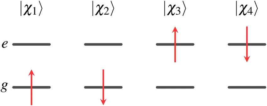 For the two-state system, there are six two-electron wave functions, two of which are singlet, two are triplet, and two contain a mixture of singlet and triplet character. These wave functions can be written as