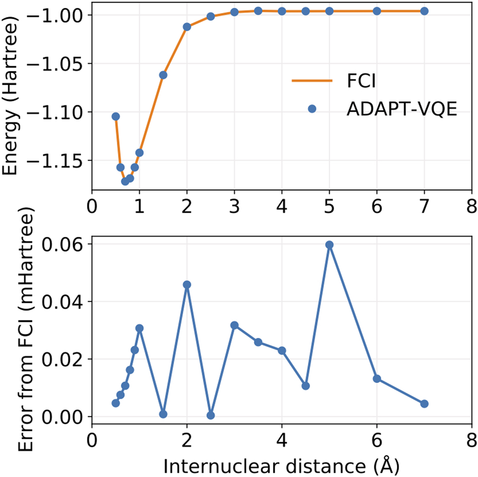 An important consideration in the performance of both VQE and ADAPT-VQE is the depth of the ansatz circuit and the time required to construct the optimal variational circuit. For electronic structures dominated by weak correlation, ADAPT-VQE tends to be very economical, adding only operators that make a meaningful contribution toward the lowest eigenvalue in the spectrum of the Hamiltonian in Eq. 14. On the other hand, the usual UCCSD, by virtue of being defined ahead of time, may contain operators with little impact on the energy, but the classical optimizer will still need to perform a number of calls to the cost function in order to find their best values. Also, the gates originating from these operators, even if they are deemed unimportant because of a small associated parameter, will nevertheless be present in the circuit, adding to its depth. If high accuracy is sought, then ADAPT-VQE may require an ansatz comprised of a large number of operators, which in turn adds to the depth of the underlying circuit. More operators also mean more variational parameters, leading to an onerous optimization process. A more detailed analysis of this trade-off can be found in Grimsley et al. (2019).