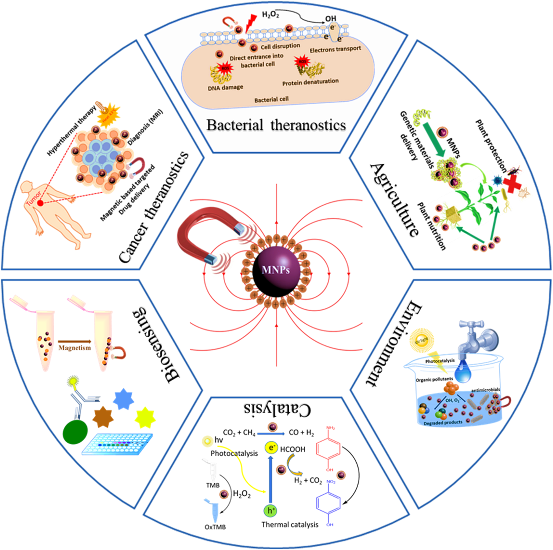 The MNPs in the past decade have gained great attention because of their promising results in various fields. MNPs with super-magnetic properties, unique size, shape, high surface area and volume ration, and biocompatibility make their application more promising. Due to these properties, it has attracted more researchers from different fields. In this review, we have summarized the applications of MNPs in some well-known fields such as biomedicine, biosensing, environment, agriculture, and catalysis. A brief description of MNPs potential applications in these fields are provided below.