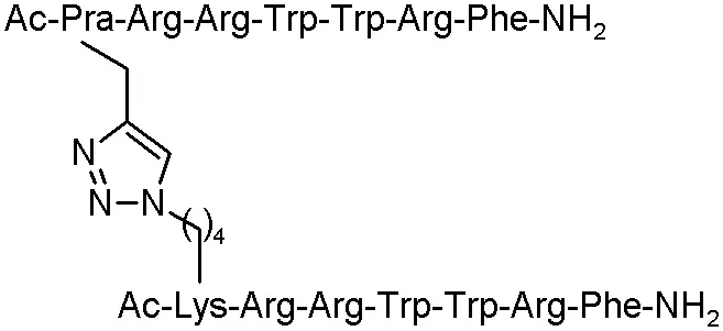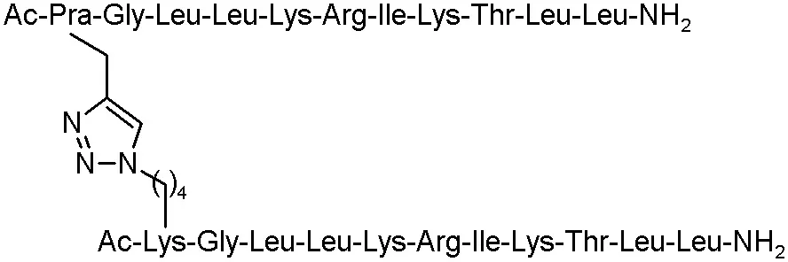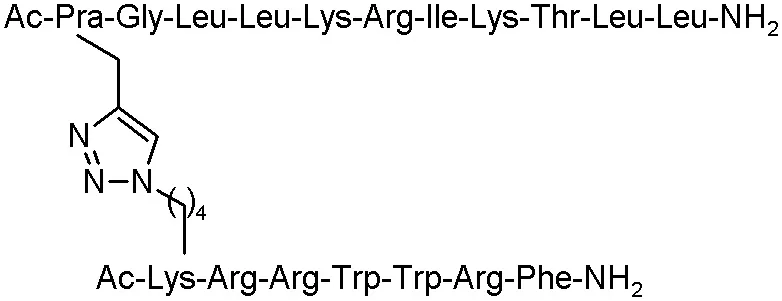 Furthermore, these peptides cross-linked by a triazole bridge, forming an α-helical structure in 50% TFE conditions, were able to kill the bacteria rapidly by membrane disruption. The toxicity study of all analogues presented that J-AR and J-RR did not display any toxicity in case of mature mice exposed to concentration up to 120 mg/Kg and the 50% lethal dose (LD50) of J-AA (53.6 mg/Kg). Additionally, the mice treated with these peptidomimetics had lower degree of bacterial load than the control group in the mouse model infected by Escherichia coli. The structure J-RR exhibited high efficiency in decreasing blood bacterial counts infected by Methicillin-resistant Staphylococcus aureus (MRSA) strain in the mouse model. These results can be the starting point for the development of drug candidates in the future (Liu et al., 2017a).