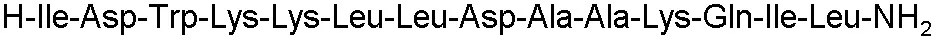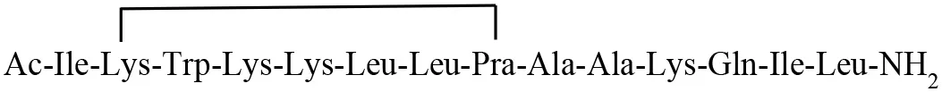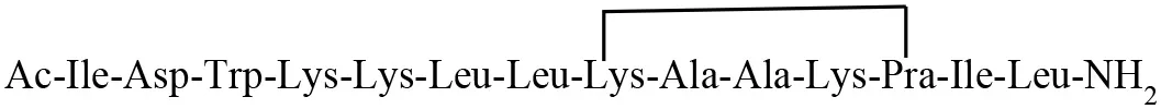The structure C-MPI-1, cyclised at the i to i+4 positions, presents an improved helical tendency in H2O, 50% trifluoroethyl alcohol (TFE), 30 mM sodium dodecyl sulphate (SDS), and enhanced stability against trypsin in comparison to MPI (parent peptide). On the other hand, the analogue C-MPI-2, cyclised at the i to i+6 positions, lost helical structure in the same environment. Therefore, the importance of the peptides helicity in antimicrobial activity was confirmed (Liu et al., 2017b).