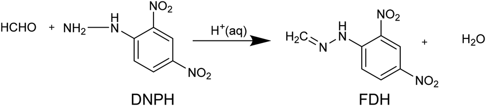 Formaldehyde derivatization reaction used in this work. We modified the method to enable analysis from non-aqueous methanol because the aqueous acid solution complicates the separation of the formaldehyde 2, 4-dinitrophenyl hydrazone (FDH).
