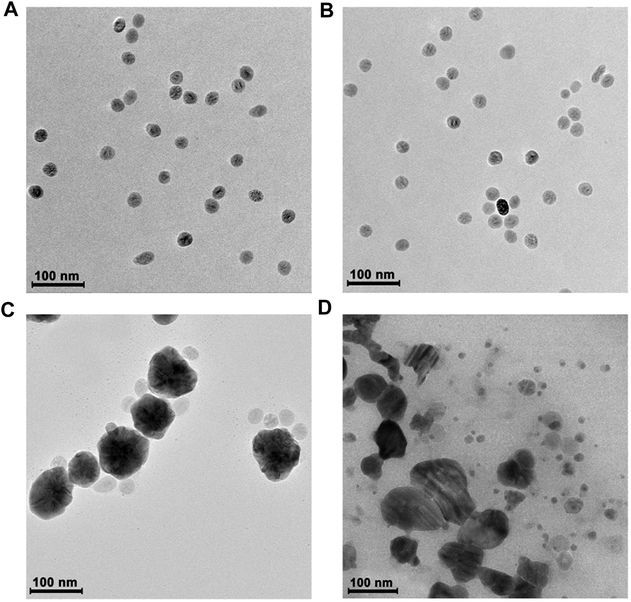 Characterization of MNPs30-COOH, MNPs30-NH2, Ag NPs, Ag-MNPs30-COOH, and Ag-MNPs30-NH2 by transmission electron microscope (TEM). (A) The shape of MNPs30-COOH. (B) The shape of MNP30-NH2. (C) The appearance of Ag-MNPs30-COOH. (D) The appearance of Ag-MNPs30-NH2.