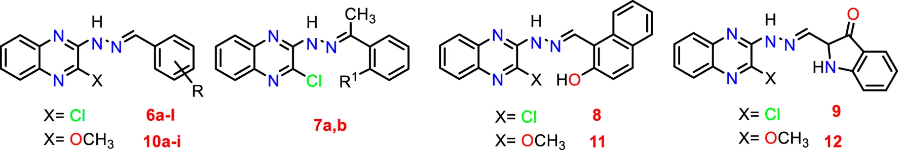 For the synthesis of the target compounds, the reaction sequences were illustrated in Schemes 1, 2. At first, o-phenylenediamine was treated with oxalic acid in the presence of 4 N HCl to afford 2,3-(1H,4H)-quinoxalinedione 3. The latter was treated with thionyl chloride in the presence of a catalytic amount of DMF to produce 2,3- dichloroquinoxaline 4 (Romer, 2009). Stirring of the 2,3 dichloroquinoxaline with hydrazine hydrate in the presence of TEA at room temperature afforded 2-chloro-3-hydrazinylquinoxaline 5. Reflux of 2-chloro-3-hydrazinylquinoxaline with commercially available aldehydes and ketones, namely, benzaldehyde, 2-chlorobenzaldehyde, 4-chlorobenzaldehyde, 2,4-dichlorobenzaldehyde, 2,6-dichlorobenzaldehyde, 2-methoxybenzaldehyde, 3,4-dimethoxybenzaldehyde, 3,4,5-trimethoxybenzaldehyde, 3-nitrobenzaldehyde, 4-nitrobenzaldehyde, 2-hydroxybenzaldehyde, 4-N,N-dimethylaminobenzaldehyde, acetophenone, 2-hydroxyacetophenone, 2-hydroxy-1-naphthaldehyde, and isatin, in the presence of a catalytic amount of acetic acid produces target compounds 6a-l, 7a,b, 8, and 9, respectively (Scheme 1). The formation of benzylidene derivatives 6a-l, 7a,b, 8, and 9 was confirmed by 1H NMR spectra, which showed the appearance of a singlet signal for benzylidene methine proton in the range of δ 7.80–8.00 ppm. This methine proton was detected also in both 13C NMR spectra resonating around 127.00 ppm. Besides, 1H NMR and 13C NMR spectra exhibited increased aromatic signals indicating that the condensation reactions were completed.