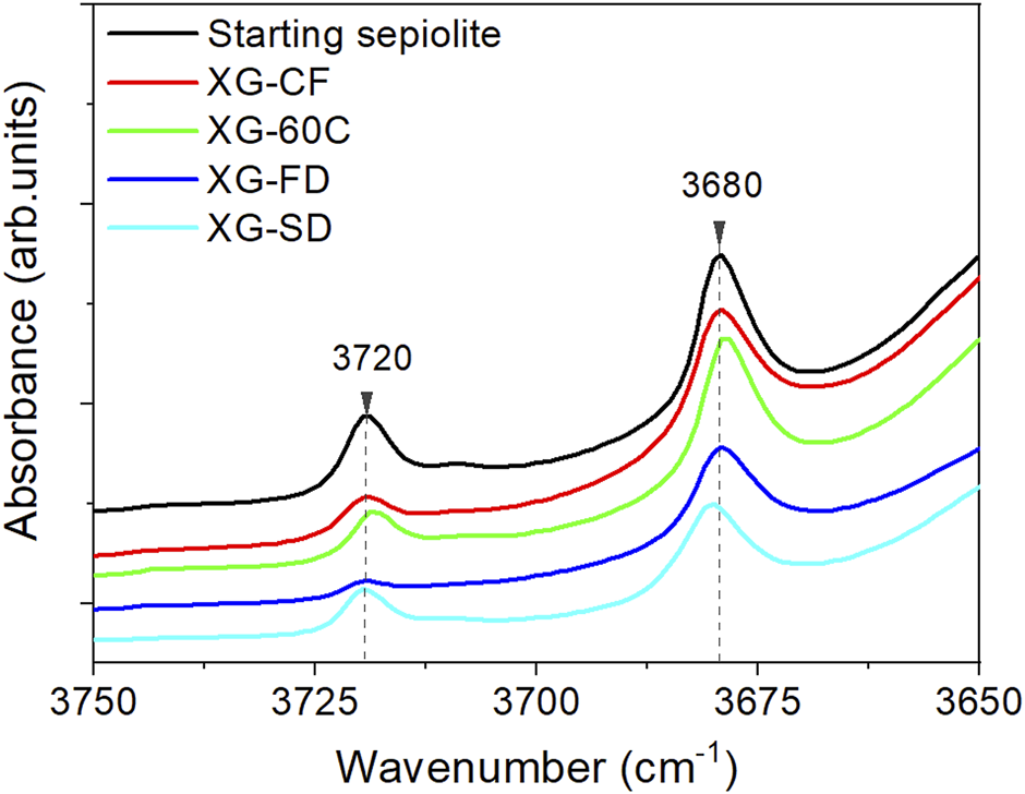 The nitrogen adsorption-desorption isotherms of the diverse prepared xerogels obtained at 77K (Supplementary Figure S1) exhibit a quite similar shape, which can be identified as type I at low relative pressure values in agreement with the characteristic microporosity of the sepiolite samples, and as type IIb at medium and high relative pressures with a narrow hysteresis loop indicating an interparticle capillary condensation. Values of BET specific surface area, external surface (SEXT), micropore volume (Vmicro) and mesopore volume (Vmeso) calculated from these isotherms are shown in Table 2. It can be observed that the values of BET specific surface are in the 118–275 m2/g range for the different samples depending on the adopted drying procedure. Therefore, the water elimination driving to the fibers re-agglomeration has a significant dependence on the adopted experimental conditions. It is also observed that the external surface values are in general less affected, being in the 102–135 m2/g range. Regarding the volume of pores attributed to the range of micropores, it also varies as a function of the applied drying process. The observed decrease is especially evident for samples also showing a decrease with respect to the starting sepiolite as this micropore volume largely contributes in the measured total surface area. As the micropores are mainly related to the structural tunnels of sepiolite, it could be admitted that a partial blockage of the micropores occurred during the disaggregation process of the fibers. This could be tentatively explained by admitting that such processes, taking place in an aqueous medium with the involvement of intense sonomechanical energy, could produce a leaching of the Mg2+ ions located at the edges of the sepiolite channels. We suggest here that a low amount of lixiviated magnesium hydroxide could thus accumulate at the surface of the silicate, preventing the access to the structural tunnels of the N2 molecules used as probe to obtain the adsorption isotherms. In fact, it has been already observed that a non-negligible fraction (<10% w/w) of Mg2+ cations and hydroxyl groups coordinated to them in the octahedral layers of sepiolite are spontaneously lixiviated when the silicate dispersions are maintained in water under continuous agitation at room temperature (Casal and Ruiz-Hitzky). To support this interpretation, it could be considered the observed relative decrease in the intensity of the O-H stretching vibrations of the Si-OH groups located at the external sepiolite surface, which appear in the IR spectrum at 3,720 cm−1, with respect to the O-H vibrations of Mg-OH located in the octahedral layer of sepiolite appearing at 3,680 cm−1 (Figure 5). Anyway, the structural alteration of the initial crystallinity of sepiolite is apparently maintained after the ultrasound treatment, according to the unchanged width of the diffraction peaks in the XRD patterns. On the other hand, the application of ultrasound is capable of producing nanometric individual fibers dispersions with a particle size distribution determined by TEM, which has been already detailed in a previous work (Castro-Smirnov et al., 2016).