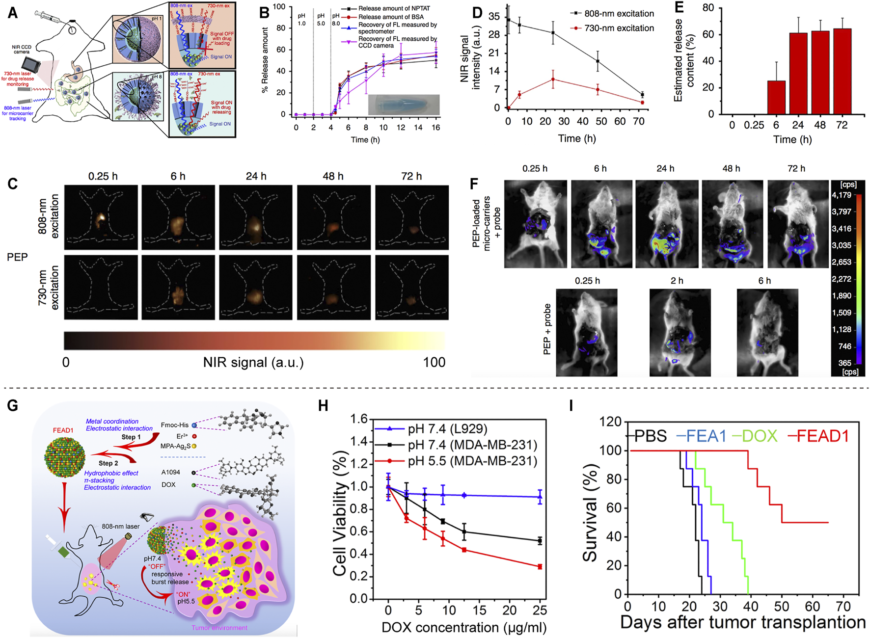 FIGURE 5. NIR-II based drug delivery. (A) Schematic illustration of the absorption competition-induced emission bioimaging system. (B) The release profiles of microcarriers in simulated gastrointestinal tract fluids. (C) Fluorescence imaging of mice after gavage with PEP-NPTAT-loaded microcarriers under excitation. (D) Signal intensity of (C). (E) In vivo release percentage of PEP-NPTAT from microcarriers. (F) Fluorescence imaging of mice after gavage with PEP-NPTAT-loaded microcarriers and a peptide probe, and PEP molecules and a peptide probe (reproduced from (Wang et al., 2017) with permission from Springer Nature). (G) Schematic illustration of the synthesis of FEAD1 and capability for tumor theranostics. (H) Cell viability of L929 and MDA-MB-231 cells under different treatments. (I) Survival curves of mice following different treatments (reproduced from (Ling et al., 2020) with permission from John Wiley and Sons).