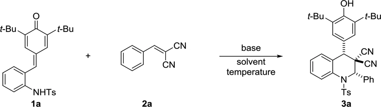 To verify the feasibility of our protocol, a serial of reaction parameters was investigated to explore the best condition for the [4 + 2] annulation. Initially, we established the model reaction using ortho-tosylaminophenyl-p-QMs 1a and α,α-dicyanoalkenes 2a as substrates (Table 1). To our delight, with the help of Cs2CO3 as base, the desired product 3a was successfully obtained in DCM at room temperature in 80% yield with excellent diastereoselectivity of >20:1 (Table 1, entry 1). Encouraged by this promising result, different bases were systematically evaluated, and we found that Na2CO3, pyrolidine, and triethylamine (TEA) were inefficient for this reaction compared to Cs2CO3 (entries 2–4). Delightfully, the organic base 1,8-diazabicyclo [5.4.0]undec-7-ene (DBU) was beneficial to this transformation, generating product 3a in 89% yield (entry 5). Then, we switched attention to solvents screening to further improve reaction efficiency (entries 6–10), and the toluene serving as reaction mediate performed best with up to 96% yield (entry 8). After the confirmation of the optimized base and solvent, the factors of temperature and substrate ratio in this base-mediated catalyst-free protocol was subsequently investigated, and it was found that none of improvement of reaction efficiency was observed when applying other temperature or substrate ratio (entries 11–14). Furthermore, we found that reducing the DBU loading to 0.01 mmol and raising the reaction temperature led to slight decrease in yield with prolonged reaction time (entries 15–16).