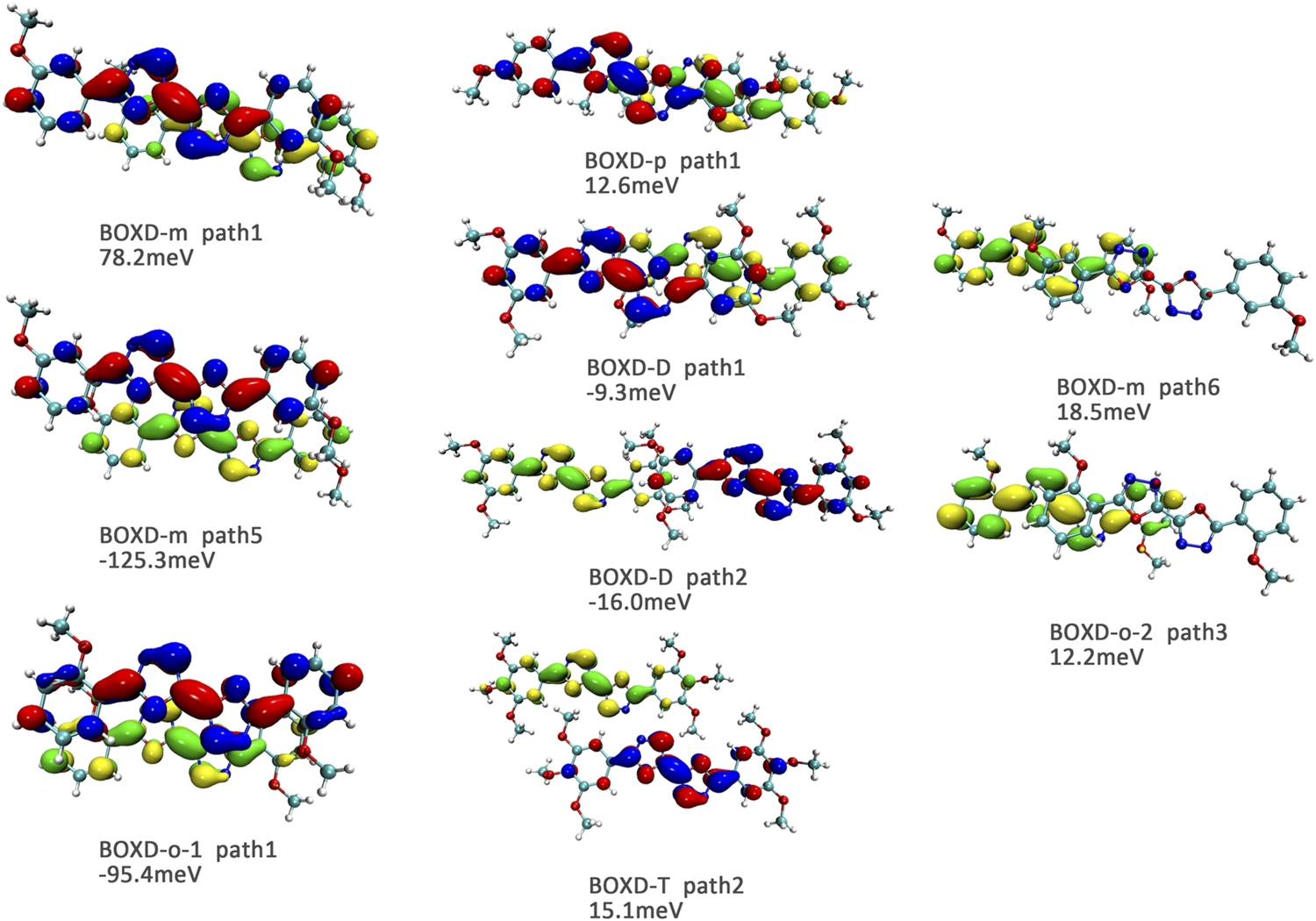 To achieve a better understanding of the difference in reorganization energy, it should be a good choice to examine the difference of electron density. Figure 9 shows the electron density difference between the neutral molecule and cation. It can be noticed that the difference in BOXD-m is tremendously small and much larger in BOXD-D, but the increases in position and degree (green) and the decreases in position and degree (blue) of electron density in BOXD-D are basically the same, which makes the reorganization energy of them smaller than others. While in BOXD-o and BOXD-p, the degree of electron density at the 5-member ring position is decreased, which causes more vibrational relaxation in the molecular skeleton. As for molecular BOXD-T, greater difference of electron density can be found at the position of the methoxyl-groups. In the process of losing electrons, not only the positively charged regions are more concentrated to the five-member ring but also electron rearrangement at the position of methoxyl group of para-C. In this case, the changes of the electron distribution will cause the structure of the methoxide group to be unstable and increase the vibration in the low-frequency region.