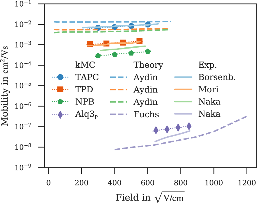 Clearly the complex interplay of these methods calls for a thorough benchmark of the method. This benchmark is all the more important, because bottom-up device calculations based on ab initio input cannot be performed with continuum models, but are—ideally—conducted by kMC calculations. Such calculations would fail if the electronic structure of the individual materials are not correctly represented. To ensure the quality of our single materials model, we apply this workflow to compute both zero-field and field-dependent mobility without the need for experimental input for a wide range of materials commonly applied in electron or hole transport layers or as host materials in emission layers. With only the molecular structure as input, the computed zero-field and field-dependent mobilities show a significantly improved agreement between simulation and experiment.