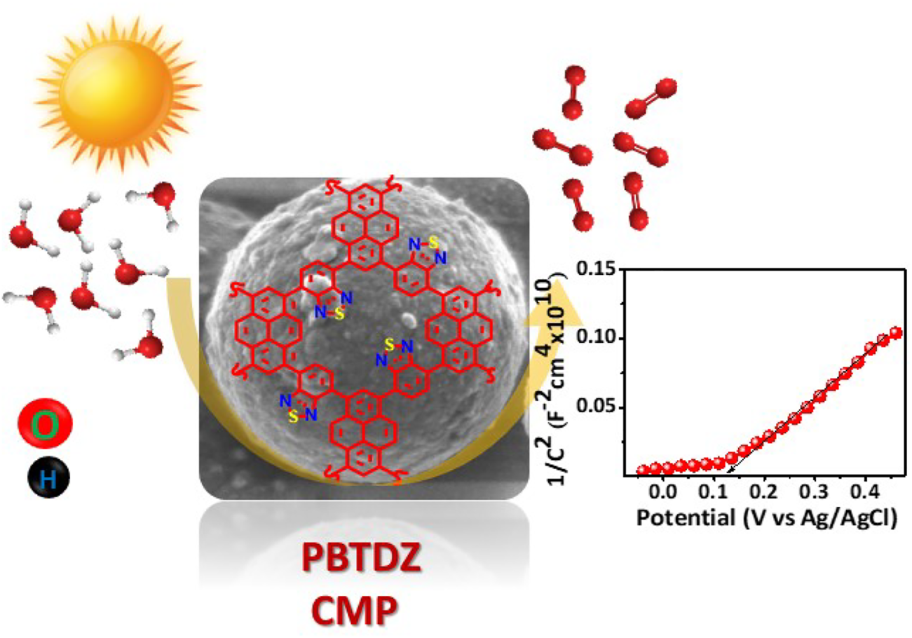 An efficient and cost-effective metal-free conjugated microporous polymer PBTDZ was synthesized via Suzuki C-C cross-coupling reaction between a tetraboronate ester and 4,7-dibromo-2,1,3-benzothiadiazole. The physical characterizations of the PBTDZ material confirmed the extended π-conjugation of sp2 hybridized carbon atoms with N-S heteroatom moieties. The material displayed visible light-induced photoelectrocatalytic activity with n-type semiconducting characteristics, exhibiting the positive photocurrent at various potentials. The CMP material played a significant role as a photo-electrocatalyst for OER in 1M KOH exhibiting a current density of 80 mA/cm2 at 0.8 V vs. Ag/AgCl and it delivered 104 µmol of oxygen in 2 h. A very low bandgap of 2.09 eV for this CMP is responsible for achieving high photoelectrochemical activity. Further, the pyrene units in the π-conjugated polymer skeleton along with heteroatoms like “N” and “S” and high specific surface area with inherent microporosity are responsible for the commendable photoelectrocatalytic activity and this will open new opportunities in electrochemical/photoelectrochemical water splitting reactions in future.