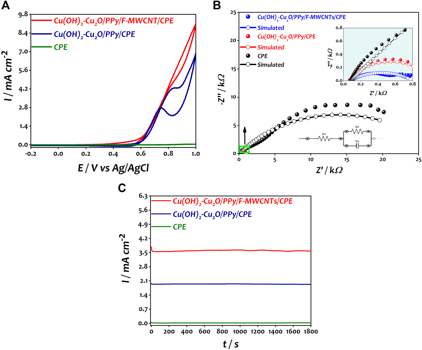 (A) Catalytic response of CPE, Cu(OH)2–Cu2O/PPy/CPE, and Cu(OH)2–Cu2O/PPy/F-MWCNTs/CPE obtained in 0.2 M ethanol in 0.1 M NaOH. (B) Nyquist plots of CPE, Cu(OH)2–Cu2O/PPy/CPE, and Cu(OH)2–Cu2O/PPy/F-MWCNTs/CPE obtained in 0.2 M ethanol in 0.1 M NaOH at 0.6 V. (C) Chronoamperometric curves of CPE, Cu(OH)2–Cu2O/PPy/CPE, and Cu(OH)2–Cu2O/PPy/F-MWCNTs/CPE obtained in 0.2 M ethanol in 0.1 M NaOH at 0.7 V.