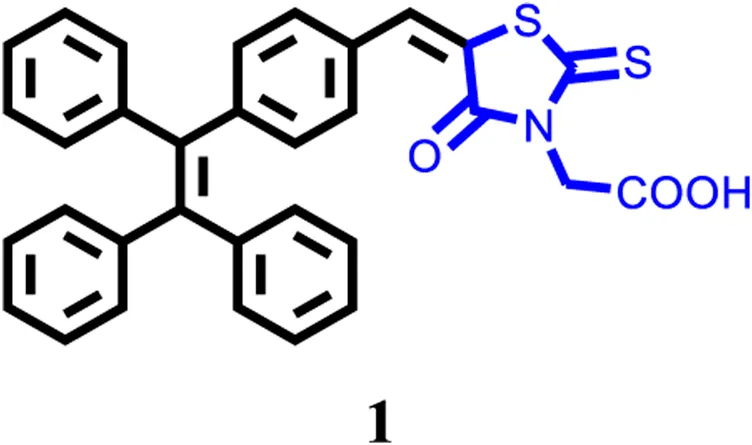 General methods: This target compound 1 was synthesized according to the route shown in Scheme 1. All synthetic experiments were performed under dry argon atmosphere applying standard Schlenk techniques. 2-(4-Oxo-2-thioxothiazolidin-3-yl)acetic acid and other starting materials and reagents were purchased from Innochem (Beijing, China) and used without further purification. Compound I-1 was synthesized according to the reported literature (Zhao et al., 2012). In addition, 1H NMR and 13C NMR spectra were collected on Bruker AVANCE NEO 500 MHz FT-NMR Spectrometer (500 MHz), chemical shift of internal standard tetramethylsilane at 0.00 ppm. Mass spectrum was collected by an ion trap MSD spectrometer (Agilent). Elemental analyses (C, H, N) were carried out with a PE CHN 2400 analyzer. Ultraviolet/Visible absorption spectra were measured on an Agilent 8453 UV-Vis spectrophotometer. Emission spectra were recorded on a Hitachi-F-4600 fluorescence spectrophotometer or an Edinburgh FLS1000 fluorescence spectrometer. DLS datum was recorded by NanoBrook 90Plus (Brookhaven Instruments). Fluorescence images were collected on an Olympus FV1000 confocal laser scanning microscope. Powder XRD experiments were carried out by Shimadzu XRD-6000 diffractometer with Ni-filtered and graphite-monochromated Cu Ka radiation (λ = 1.54 Å, 40 kV, 30 mA).