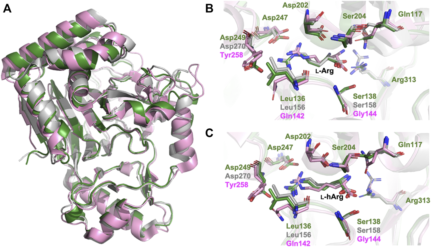 Structural comparison of CmnC, VioC, OrfP. (A) Superposition of the overall structures of CmnC, VioC, and OrfP. Local view of the (B)l-Arg binding and (C)l-hArg binding in CmnC, VioC, and OrfP. CmnC, VioC, and OrfP are colored green, grey, and pink, respectively.