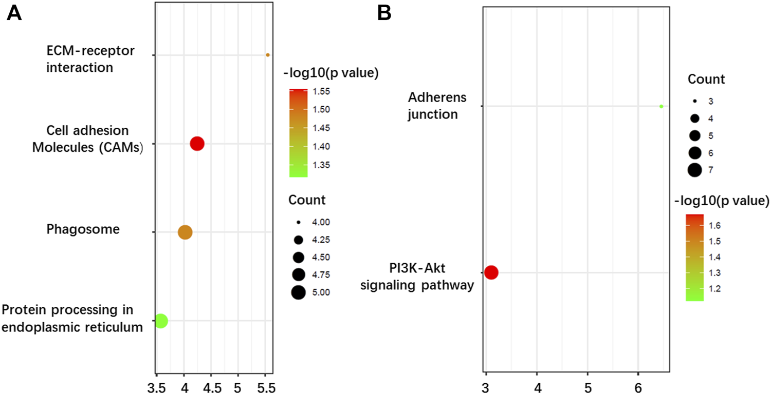 As far as BP is concerned, both upregulation and downregulation were active in the cell adhesion process. However, upregulation was more involved in cell adhesion, while downregulation was more active in DNA repair. For CC analysis, both up- and downregulation were circulated mainly in integral components of the membrane. Furthermore, upregulations also circulated in the extracellular region, which implied that after complete glycosylation modification, proteins were effectively secreted to the extracellular domain and exercised effective biological regulatory functions. The downregulations showed mostly membrane circulation without the extracellular region. In addition, some of the downregulations function specifically as the components of the Clu4-RING E3 ubiquitin ligase complex and voltage-gated sodium channel complex. The results of MF showed that upregulations exhibited significant enrichment in the activities of protein tyrosine phosphatase activity, integrin, and actin filament binding, while downregulations exhibited significant enrichment in the activities of ATP-binding. KEGG pathway analysis further indicated that the upregulations were enriched in cell adhesion molecules, phagosome, ECM-receptor interaction, and protein processing in the endoplasmic reticulum (Figure 6A), while downregulations were focused on only two pathways: PI3K-Akt signaling pathway and adherens junctions (Figure 6B).