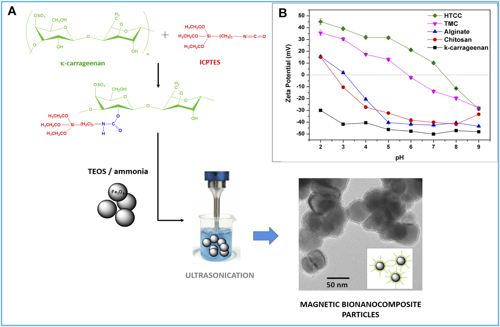 (A) Scheme illustrating the chemical route to prepare the silicon alkoxide derivative of the biopolymer k-carrageenan and the preparation of the magnetic biosorbents through coating the Fe3O4 nanoparticles with the bio-hybrid siliceous shell; (B) Potential zeta values of magnetic biosorbents prepared using distinct biopolymers (HTCC -N-(2-hydroxypropyl)-3-trimethylammonium chitosan; TMC- trimethylchitosan).