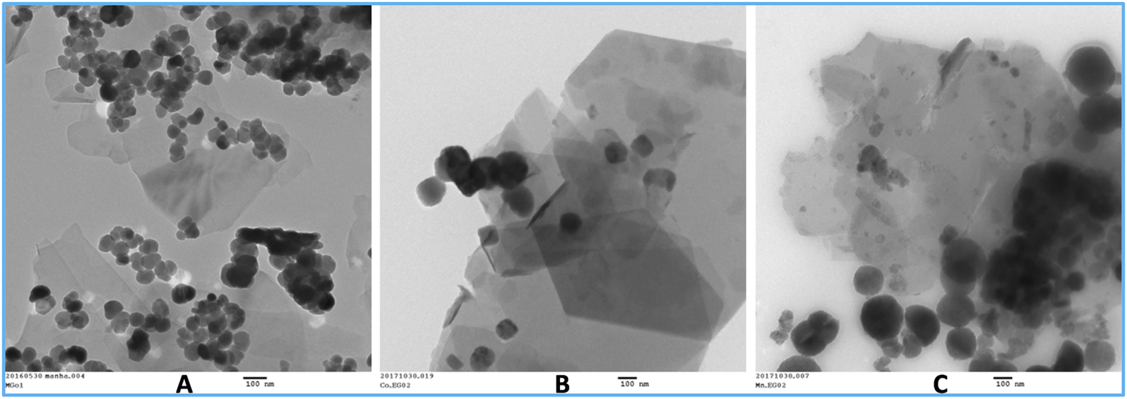 TEM images of nanocomposites: (A) Fe3O4/GNPs; (B) CoFe2O4/GNPs and (C) MnFe2O4/GNPs.