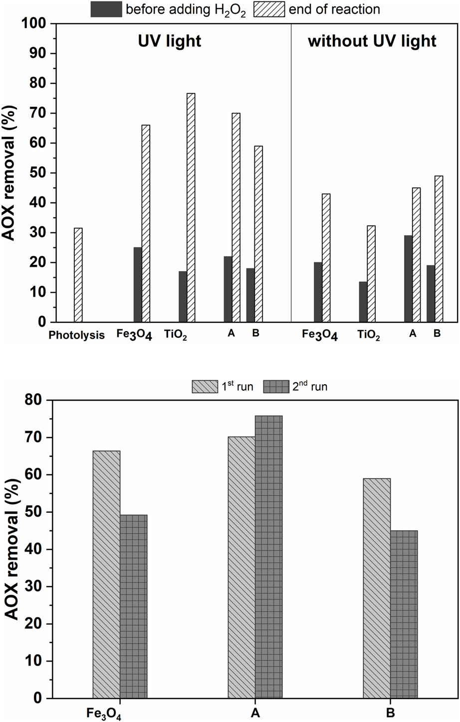 AOX removal in a real aqueous effluent as a function of photocatalyst used (A) in the presence or absence of UV light irradiation (top) and in two consecutive photocatalysis runs using Fe3O4 and Fe3O4/TiO2-A and B photocatalysts (bottom). Reaction conditions: 2 mg of photocatalyst; AOX effluent (200 ml); 30 wt%, H2O2 (9.8 mmol); 57°C; 1 h reaction time.