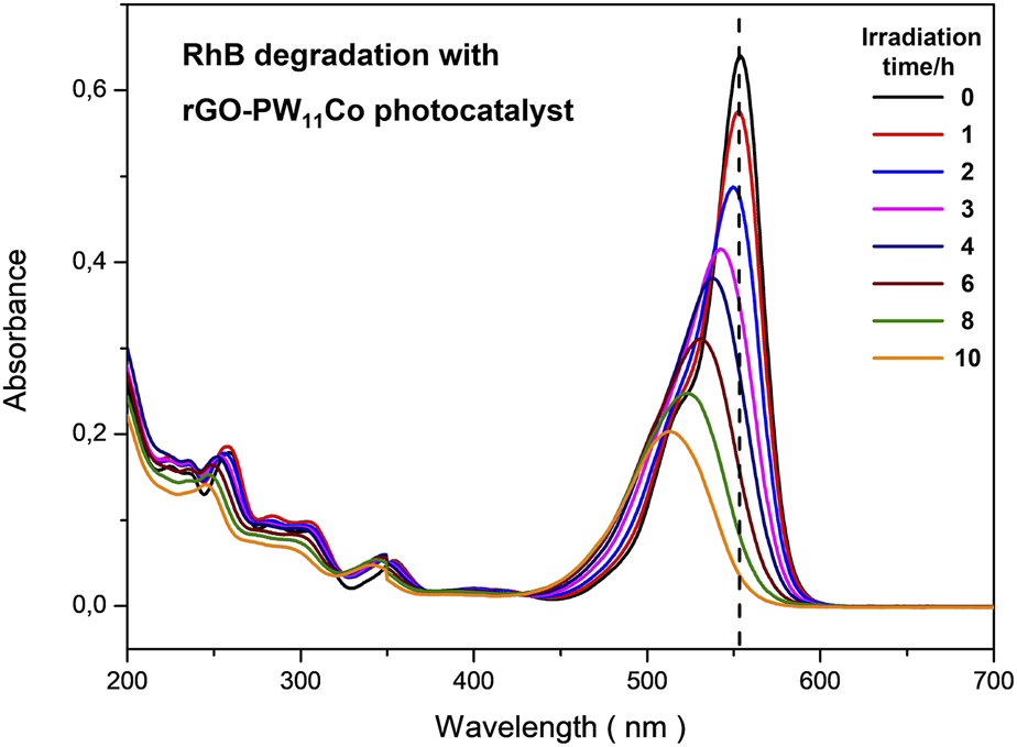 To evaluate the photocatalytic activity in the visible of the polyoxometalate [PW11CoO39]5− supported in rGO (rGO-PW11Co), the photodegradation of Rhodamine B (RhB) under visible-light irradiation was conducted at room temperature. RhB was selected as an organic dye model because it shows strong absorption in the visible region (maximum at 554 nm, Figures 5, 0 h) and is photostable in the absence of photocatalyst. As control, identical experiments in the dark were also carried out. The results for a blank experiment, without catalyst, demonstrate that RhB concentration was practically unchanged, suggesting that RhB is stable under visible-light irradiation. Comparative photocatalytic studies using as catalyst the supported rGO-PW11Co material and the pure solid K5 [PW11CoO39], respectively, under the same experimental conditions, demonstrate that rGO-PW11Co shows higher photocatalytic activity than the polyoxometalate by itself. The photodegradation of RhB is closed to 95% after 600 min in the presence of rGO-PW11Co catalyst, under visible-light irradiation. The degradation of RhB is followed by the decrease in the characteristic absorbance at 554 nm as well as the maximum absorption shift over time (Figure 5).