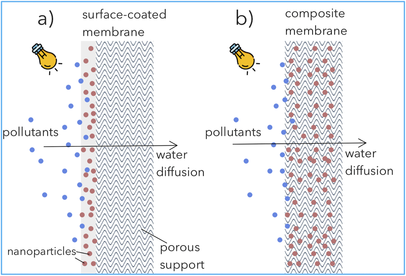 Schematic representation of nanoparticles immobilized in/on composite membranes: (A) surface-coated membrane; (B) nanoparticles matrix-blended membrane.
